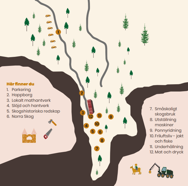 På området finns aktiviteter för både vuxna och barn. Du kan köpa mat och fika, låta barnen leka i hoppborgen eller prova ponnyridning. Runtom står utställare med allt från lokalt mathantverk, slöjd till jakt, fiske och friluftsliv. Våra skogsinspektorer från Norra Skog finns på plats för frågor och samtal. Dessutom visas både moderna och historiska redskap och maskiner för den som vill lära sig mer om skogsbruket.