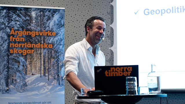 Norra Skogs marknadschef Jonas Arvidsson erbjöd konferensens besökare en marknadsmässig inblick i Norra Skogs skogliga verksamhet. Jonas beskrev det utmanande läget för massaved och biobränsle i tider av minskad avverkning bland flera stora skogsägande aktörer, men avslutade med positiva framtidsutsikter för vår ekonomiska förening, som Norra Timber är en del av.