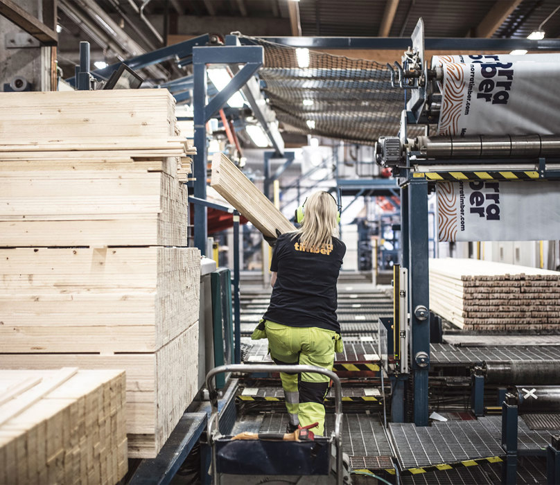 Produkterna vidareförädlas genom torkning, hyvling, kapning, hållfasthetssortering och impregnering.