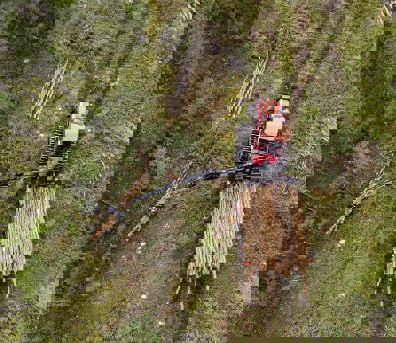 Nu avverkas de flesta träden i beståndet. Målet är att optimera värdet via kloka val av sortimentsuttag och aptering (hur trädet kapas upp i olika sortiment beaktat kvalitet och dimension).
