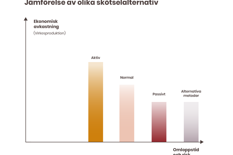 Genom att investera i rätt åtgärd vid rätt tidpunkt kan skogsägaren öka lönsamheten och värdetillväxten och samtidigt begränsa riskerna i sitt skogsbruk. Man kan likna skötselprogrammet med en ledstång som beskriver hur olika skogliga åtgärder hänger ihop i tid och rum för att tillsammans bidra till ett värdeskapande. Visste du att aktiv skogsskötsel kan ge dig upp till 30 procents ökad lönsamhet jämfört med passivt brukande eller med alternativa metoder. Generellt sett ger ett aktivt skogsbruk, högre ekonomisk avkastning och samtidigt kortare omloppstid, till en lägre risk.